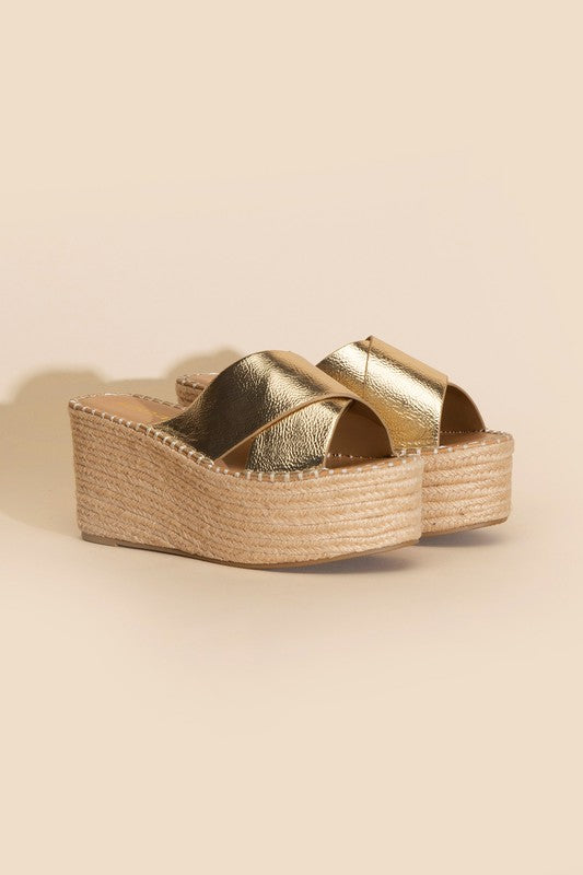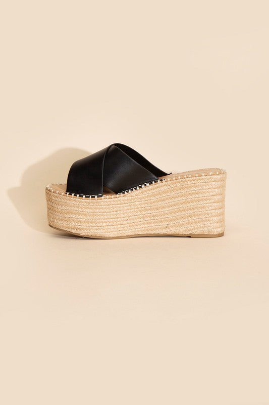Synthetic raffia wedges platform slides Toe: Open toe, round Heel shape: Platform Material: Synthetic Imported. Made in China Care Instruction: Use a soft cloth and a little lukewarm water to clean the footwear after use. If necessary, add a small amount of mild soap Carefully wipe off soap residue with a damp cloth