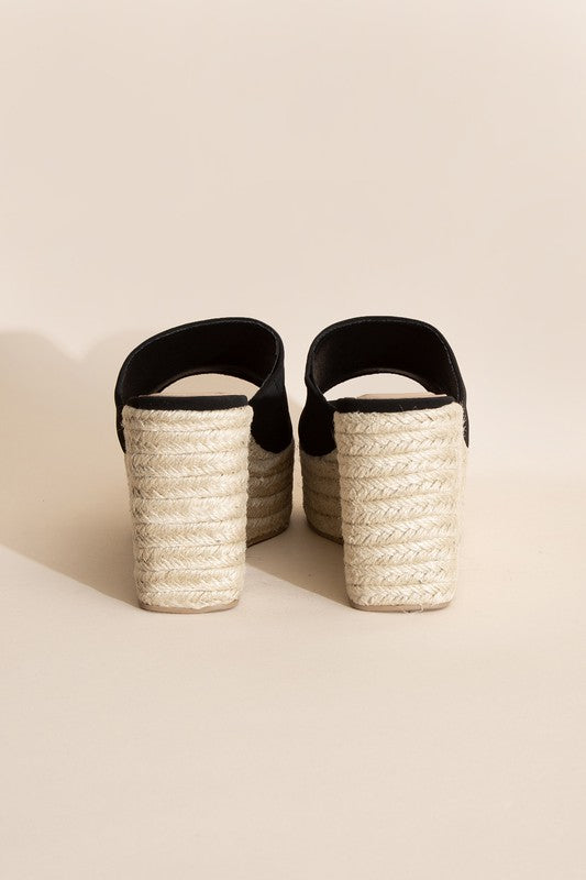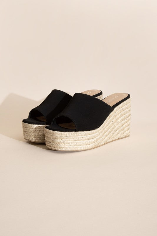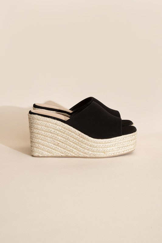 Synthetic raffia wedges platform heels Toe: Open toe, round Heel shape: Wedge Material: Synthetic Imported. Made in China Care instruction: Use a soft cloth and a little lukewarm water to clean the footwear after use. If necessary, add a small amount of mild soap. Carefully wipe off soap residue with a damp cloth
